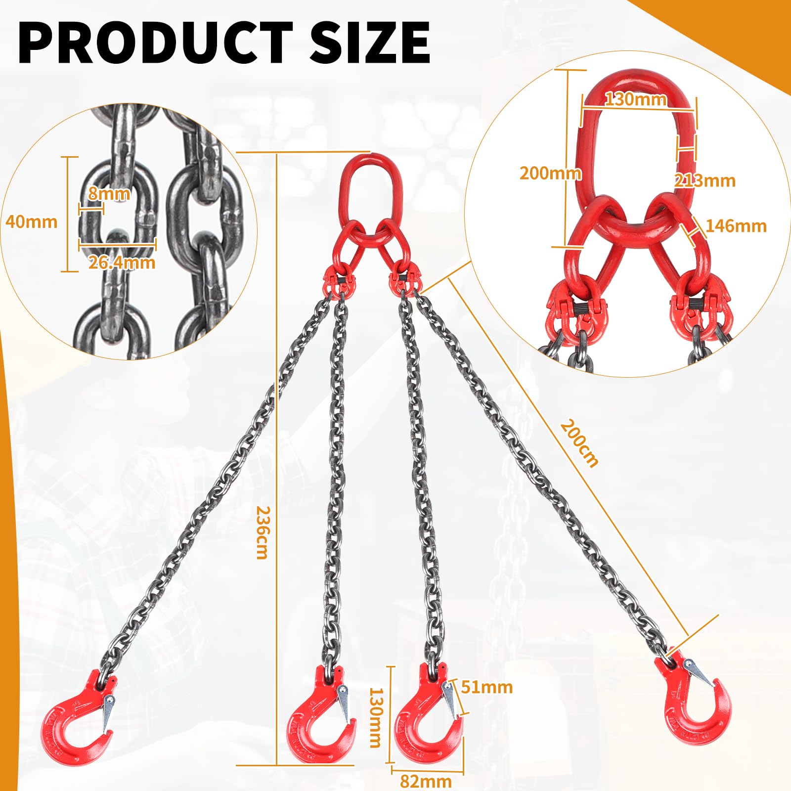 Forst Zubehör 5T 1.5Mx8Mm 4-Strang KrangehäNge Anschlagkette Krankette RüCkekette Chokerkette KettengehäNge Kettenschlingen Hebewerkzeug Kette VerküRzungshaken Hebekette Gabelkopfhaken FüR Kran Baustelle Fabrik Kettengehänge Für Kranken ⛓️【Hochwertige Materialien】Die G80 Mn-Stahlkette und legierten Stahlhaken (35CrMo) mit Pulverbeschichtung sind verschleiß- und hitzebeständig. Produktmerkmale: 🔗 Großes Tragvermögen: Das Kettengehänge ist auf eine beeindruckende Traglast ausgelegt und eignet sich ideal für anspruchsvolle Hebeaufgaben. 4 Strang Kettengehänge Anschlagkette Krangehänge 1m / 2 m Kette 8mm Sicherheitsmerkmale Objekte müssen im Zentrum des Hakens hängen, und verdrehte, umgekehrte oder verwickelte Ketten sind nicht erlaubt. ⛓️【Robuste Konstruktion】Unsere Kettengehänge bestehen aus hochfestem G80 Mn-Stahl und legiertem Stahlhaken, die mittels vollautomatischer Schweißtechnologie hergestellt werden. Hinweis: Immer innerhalb der angegebenen Traglastgrenze verwenden. ⛓️ Schwere Kette: Die Kette besteht aus G80 Mn-Stahl und ist verschleißfest, wodurch eine langfristige Nutzung gewährleistet ist. Keine verdrehte oder verknotete Kettenlänge zulassen. Diese Anschlagketten eignen sich ideal für Hebe- und Transportaufgaben in Fabriken, Baustellen, Bergbau, Häfen und anderen Bereichen. Ihr supergroßes Tragvermögen ermöglicht den Einsatz bei schweren Lasten in verschiedenen Umgebungen. ⛓️【Weite Anwendungsbereiche】Diese Forstkette Rückeketten eignen sich perfekt für verschiedene Hebe- und Transportaufgaben in Fabriken, Baustellen, Bergbau, Häfen und mehr. ⛓️【Hohe Sicherheit und Flexibilität】Die Kettengehänge bieten mit einem zuverlässige Sicherheit. Achten Sie darauf, die angegebene Tragfähigkeit niemals zu überschreiten, und tragen Sie beim Umgang mit den Ketten Handschuhe. 4-Strang Anschlagketten GK 8 - Konfigurieren Sie sich Ihr Kettengehänge nach Tragfähigkeit, Länge, Endbeschlag und Verkürzung Perfekt für schwere Lasten und anspruchsvolle Umgebungen. Ideal für Hebe- und Transportaufgaben mit höchster Zuverlässigkeit und Sicherheit. Weite Anwendungsbereiche Diese Forstkette Rückeketten eignen sich perfekt für verschiedene Hebe- und Transportaufgaben in Fabriken, Baustellen, Bergbau, Häfen und mehr. Beschädigte, defekte oder abgenutzte Ketten nicht verwenden. ⛓️【Sicherheitsmerkmale】Objekte müssen im Zentrum des Hakens hängen, und verdrehte, umgekehrte oder verwickelte Ketten sind nicht erlaubt. 4- Strang Kettengehänge | Güteklasse 8 | 8 mm Lieferzeit: 5-7 Werktage (Ausland abweichend) Werkstoff: hochfester Vergütungsstahl, Güteklasse 8 Gliedmaß: 160 x 90 mm, DGUV-geprüft (H-Stempel Hohe Sicherheit und Flexibilität Die Kettengehänge bieten mit einem zuverlässige Sicherheit. Hergestellt aus hochwertigem G80 Mn-Stahl für eine beeindruckende Traglast und widerstandsfähige Legierungshaken (35CrMo), erfüllt es höchste Anforderungen an Festigkeit und Härte.